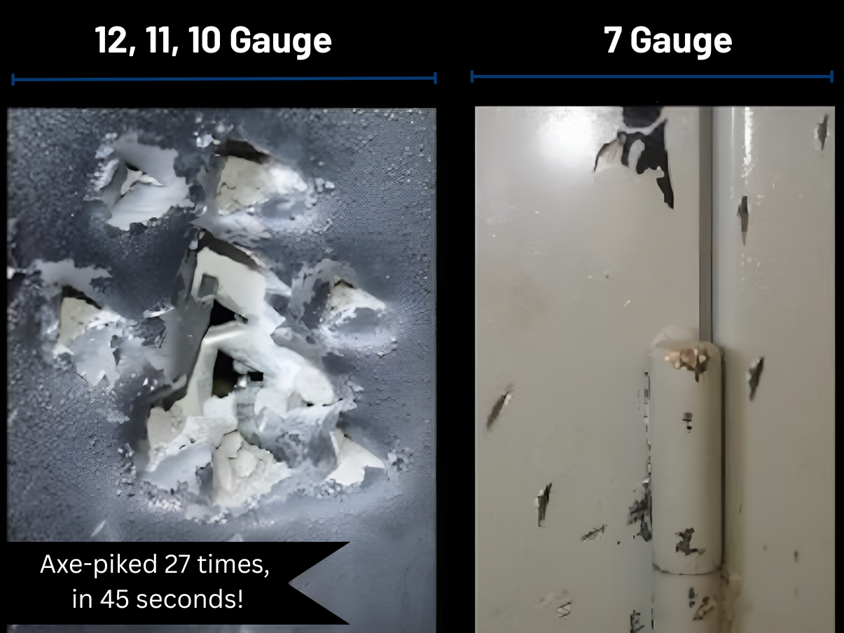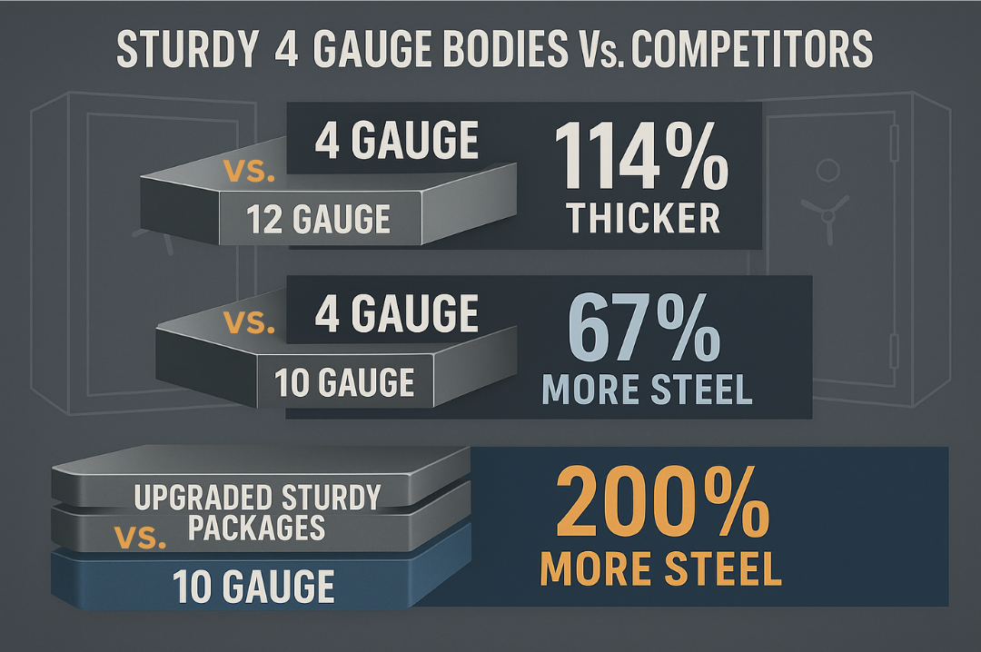 Sturdy Gun Safe’s Heavy Duty Safe Line starts with .22" thick steel bodies (including the top and bottom) — equivalent to a heavy 4 gauge — providing far more protection than the thin sheet metal found on most safes. For customers who want even greater strength, we offer upgrade packages that reinforce the body up to 3/8" thick and beyond.