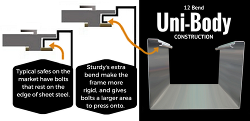 Sturdy Gun Safes are built with a true uni-body design—crafted from a single sheet of steel bent twelve times for maximum strength. This eliminates weak vertical seams and splicing at the door seat, creating a cleaner, stronger body that naturally forms into its own reinforced door seat. Unlike the few competitors that use uni-body construction, Sturdy goes further with two additional bends at the door seat, adding rigidity and giving the locking bolts a stronger, more secure surface to bite into. The result is a tougher, more reliable safe built to stand up to real attacks.