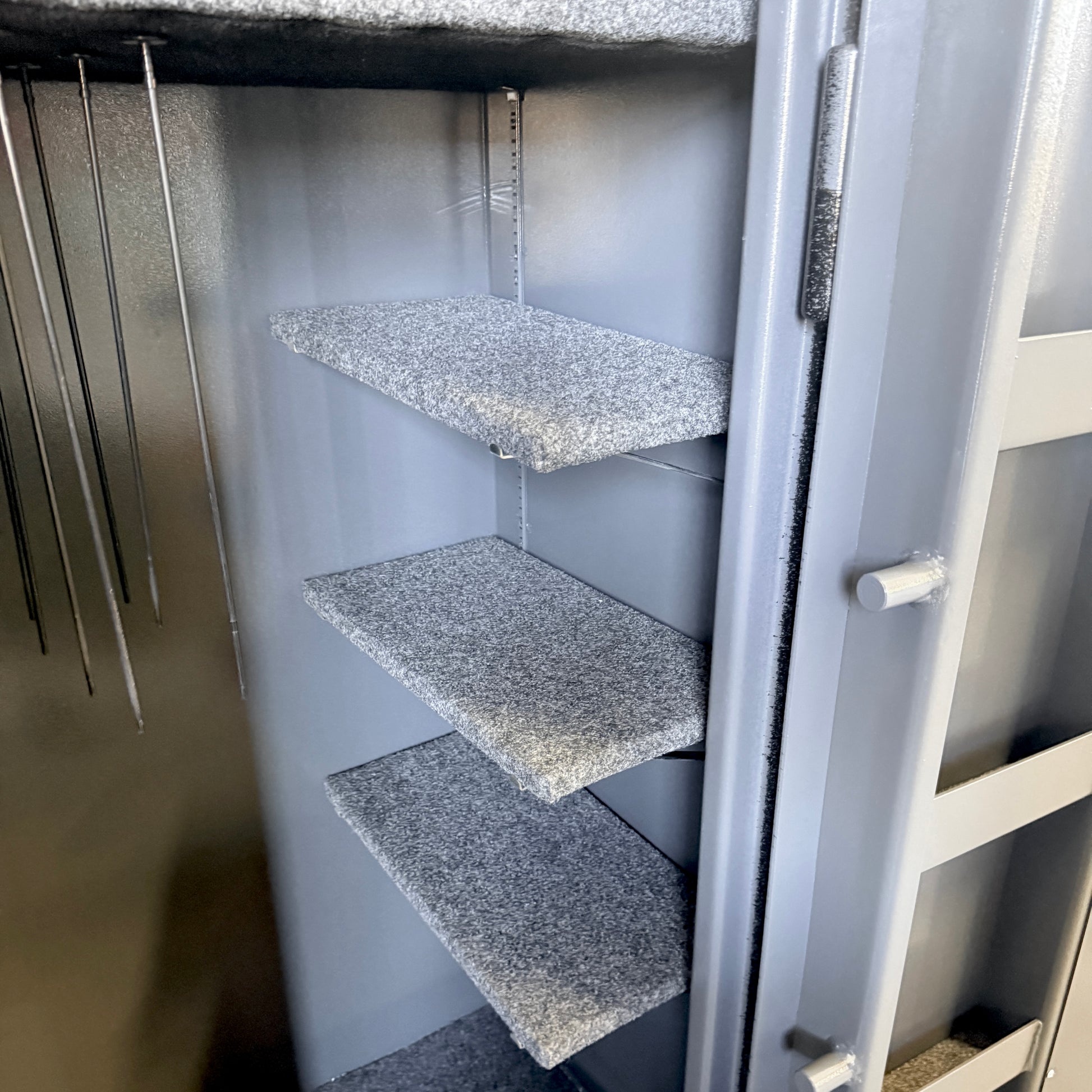 This interior is best for those who don't have many long guns and would like larger side shelves that carry more weight. We will call you for the best division. Comes with 1 gun rack, 3 side shelves and 1 top shelf (2 for 6ft tall safes). All shelves would carry 150 lbs.